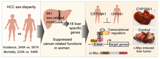 在这些性别差异分子中,细胞色素P450家族成员CYP39A1为常染色体定位的肝脏特异表达基因,其在女性肝脏中的表达明显高于男性肝脏,而且在>93% 肝细胞癌患者中表达明显沉默。在小鼠原位肿瘤实验中CYP39A1可以显著抑制肝细胞癌的发生和发展,此作用不依赖该基因的已知细胞色素P450酶代谢功能,而是通过影响c-Myc与其功能调节蛋白的相互作用,抑制了c-Myc转录因子的转录激活活性,从而阻断肝细胞癌的发生与发展。另外,在多种小鼠原位肝细胞癌模型实验中,CYP39A1在显著抑制肿瘤发生和发展的同时,并未改变小鼠的性激素水平,也未造成任何小鼠两性性征的改变。