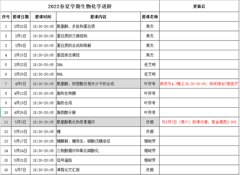 各位同学:根据学校节假日课程安排调整通知,生化课程更新如下: