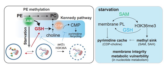 图1:在细胞适应饥饿环境的过程中,磷脂酰胆碱PC合成和组蛋白H3K36甲基化