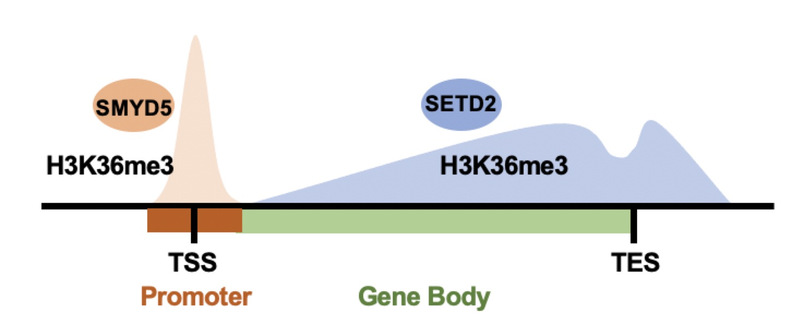 图1. SMYD5催化启动子区H3K36me3,SETD2催化基因区H3K36me3