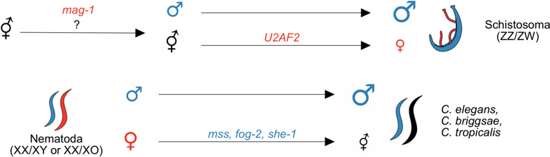 最后,由于扁形动物门中只有吸虫为雌雄异体,其他的物种(如涡虫,绦虫等)都为雌雄同体,而两者分歧仅为70百万年以内[4]。因此通过对它们的比较可以揭示从扁形动物门无性生殖的祖先向有性生殖的吸虫演化过程中,基因组和转录组所发生的变化规律。研究鉴定了一个在果蝇和吸虫中都功能高度保守的雌性相关的基因mag-1,该基因可能发生的隐性突变可能使雌雄同体的祖先雌性不育从而产生雄性个体。其次,第二个突变可能产生了雌性化基因U2AF2[5],从而完成了性别系统的转换过程(图3)。而全基因组水平来说,该转化过程主要涉及性腺转录组偏向去雌性化(即雌雄异体物种卵巢中的基因表达量相比雌雄同体的祖先性腺总体下降)的过程。在线虫动物门中,秀丽隐杆线虫发生了相反的转化,即由雌雄异体的祖先丢失了性别,反向演化为雄性和雌雄同体,而相应地,这一转化主要涉及转录组水平的去雌性化和雄性化。