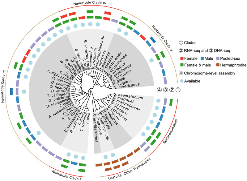 2022年6月10日,我院周琦课题组在Nature Communications杂志上发表了题为“Evolution of sexual systems, sex chromosomes and sex-linked gene transcription in flatworms and roundworms”的研究论文,系统阐述了扁形动物门和线虫动物门物种的性别和性别染色体是如何起源和演化的。这两个庞大的分类阶元包含了大量造成人类或者家禽家畜严重疾病的寄生虫。其中包括扁形动物门的血吸虫,其导致的疾病是继疟疾之后世界上传播最广的寄生虫病。世界卫生组织估计直至2022年全球约有7.79亿人面临血吸虫感染风险。而线虫动物门除了科学家熟悉的模式动物秀丽隐杆线虫,也包含了其他会引起疾病的蛔虫,丝虫,鞭虫和钩虫。值得注意的是,许多这些物种在比较晚近的演化时间阶段经历了由无性向有性生殖(或反之)的转换,是不可多得的研究动物性别如何起源的模型。