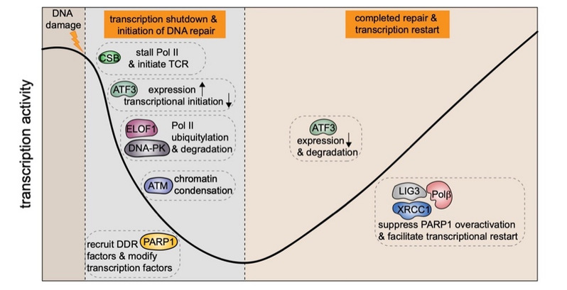作为生命的基本组成单位,细胞时刻受到内部因子如细胞代谢产生的自由基或外界因子如紫外线、电离辐射、化学药物等的刺激发生DNA损伤,这对细胞基因组完整性构成了巨大威胁。维持基因组稳定性是细胞生存的基础,这是因为遗传物质的异常改变会导致细胞内各种复杂生物学过程的稳态失衡,进而影响细胞的生理功能,改变细胞命运。例如,DNA复制和转录作为遗传物质传递和解码的两个重要生理活动,其精准调控必须建立在基因组稳定性的基础之上。因此,为了应对DNA损伤胁迫,细胞进化出了一套高度协调的DNA损伤反应信号机制用于感知和修复受损的DNA,并根据损伤类型和细胞所处的周期启动特异性的修复途径。过往研究中,科学家致力于鉴定各条DNA修复途径中的核心因子,并解析这些因子如何作用于受损的DNA完成修复过程,却往往忽略了它们与其它DNA相关活动如基因转录间的相互联系。近期研究表明,DNA损伤修复转录过程并不彼此独立,而是紧密协调的,其中的奥秘正被逐步揭开。