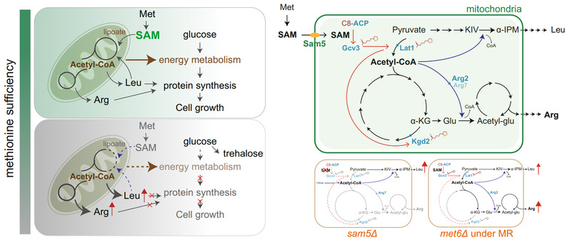 一个关键科学问题是线粒体是如何感受到蛋氨酸限制带来的SAM匮乏条件呢?在蛋氨酸限制条件下,受限的丙酮酸脱氢和α-酮戊二酸脱氢化学反应对应着化学原理类似且结构都很庞大的两个代谢酶复合物,在其中一个亚基上可以发生一个酶活性必需且高度保守的硫辛酰化修饰(lipoylation),而硫辛酸(lipoic acid)的合成依赖于SAM自由基和铁硫簇。通过生化和代谢追踪实验,研究人员成功证明了蛋氨酸减少直接限制了硫辛酸合成。更有意思的是,因为硫辛酸合成后转移到丙酮酸脱氢酶和α-酮戊二酸脱氢酶上的次序不一样,所以这两个被硫辛酰化修饰的酶所受影响的程度也不一样,最后导致了蛋氨酸限制下特异的代谢流向,即乙酰辅酶A与α-酮戊二酸退出TCA循环转至氨基酸合成。研究还发现,当线粒体在极度缺乏SAM的时候,会进一步激活亮氨酸合成,导致乙酰辅酶A上游的丙酮酸也退出能量代谢。