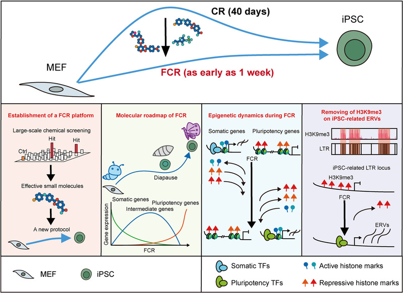 综上所述,这项研究采用新筛选策略开展大规模小分子筛选,发现了一系列可以促进化学重编程的小分子,并对这些小分子进行最优组合和浓度测试,自主研发了细胞快速化学重编程FCR新体系;利用多组学整合分析,系统描绘了FCR过程基因表达和表观遗传动态,发现其后期经历独特的滞育类似状态,并揭示H3K9me3通过抑制多能性相关ERVs从而阻碍重编程。有意义的是,该研究提供了一个高效快速的细胞化学重编程技术平台,并揭示了独特的细胞命运重塑机制,有助于研究者们进一步探索和理解细胞身份建立与维持的基本原理;该研究为化学重编程技术的临床应用——利用药物提高再生能力缺乏或较弱的组织的可塑性从而应用于再生医学或延缓衰老——提供了理论基础和技术支撑。