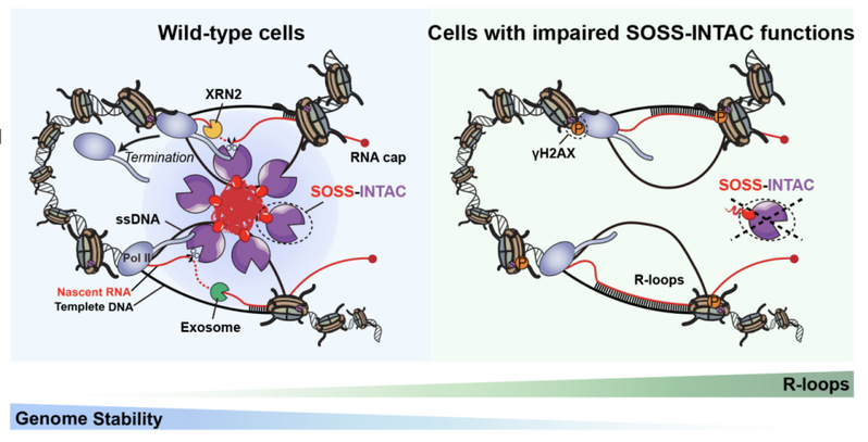 图1: SOSS-INTAC复合物在转录与基因组稳定性维持中的工作模式图