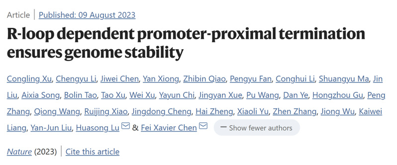 2023年8月9日,我院陆华松实验室与复旦大学陈飞研究员团队合作在Nature杂志在线发表题为“R-loop dependent promoter-proximal termination ensures genome stability”的研究论文。这项工作首次报道了由INTAC复合物与单链DNA识别复合物SOSS形成的新型复合物(命名为SOSS-INTAC复合物),发现其以凝聚体的形式调节细胞内R-loop水平,维持基因组稳定性,展示了SOSS-INTAC复合物在转录与基因组稳定性维持中的“双重质控”重要功能。