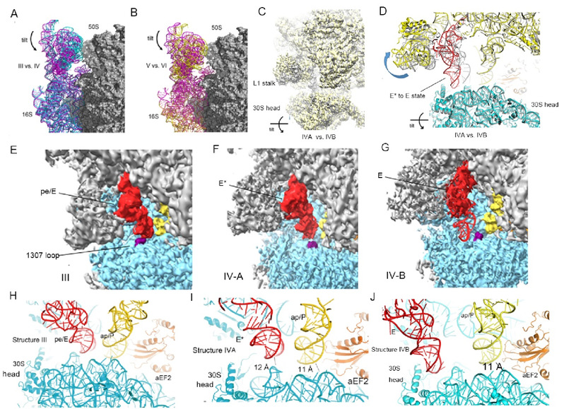 Sac 70S 复合物在 tRNA 移位的七个不同阶段被捕获,证实了古菌核糖体移位过程中的保守结构特征。该研究还鉴定出两个新的移位过程中间态,解释了移位后期阶段,核糖体如何释放已经移动了的tRNA的分子机制。即在 aEF2 结合的 70S 核糖体复合物中,基于 30S 头部结构域的3D 分类确定了两个新的移位中间体复合物,其中 30S 头部结构域倾斜 5°-6º 以使其能够与移位的 P位点tRNA 脱离,从而释放tRNAE位点(图2。同时可以观察到aEF2III-V结构域的构象变化。以上结构为古菌翻译和核糖体移位提供了新的见解。