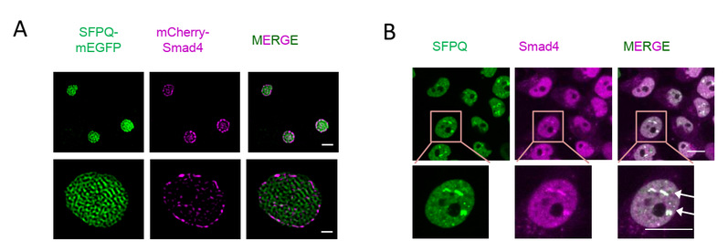 图1:SFPQ凝聚体在分子(A)和细胞(B)水平滞留抑癌蛋白Smad4。