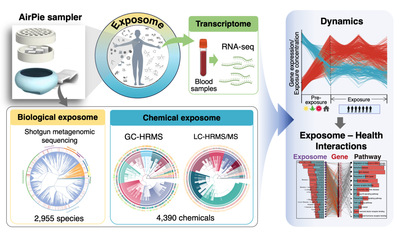 研究团队开发了一种名为AirPie(中文名:气派)的聚二甲基硅氧烷(PDMS)可穿戴被动采样器,该设备具有轻便、价格低廉、无侵入性的特点。该设备与非靶向液相色谱-高分辨率串联质谱分析(LC-HRMS/MS)、非靶向气相色谱-高分辨率质谱(GC-HRMS)和宏基因组鸟枪测序法相结合,可以实现对个体空气微生物和化学暴露的全面解码。这是首次将非靶向LC-HRMS/MS和宏基因组鸟枪测序法技术应用于有机硅被动采样器来分析个体暴露组。