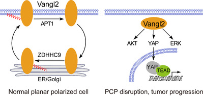 平面细胞极性(planar cell polarity, PCP主要表征蛋白质和细胞器在细胞平面上的不对称分布,对细胞间通信、胚胎发育、组织稳态至关重要PCP缺陷会导致多种人类疾病,包括出生缺陷、癌症等。因此,深入理解PCP的分子调控机制对基础和转化研究均具有重要意义。PCP的建立依赖于其核心组分的动态运输和不对称分布。Vangl2PCP的核心组分,其功能异常和神经管缺陷(neural tube defects, NTD)、癌症等疾病关系密切。Vangl2的动态定位对其功能发挥十分关键,但调控Vangl2动态定位的分子机制尚不明确。蛋白质长链脂肪酰化long-chain fatty acylation, LCFA)修饰能够显著增强蛋白质的疏水性与膜亲和性,对蛋白质的运输、亚细胞定位、蛋白质间的相互作用等具有重要影响