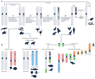 此外,在性染色体的起源和演化的过程中,重组抑制是其中非常关键的事件。性染色体上被抑制的区域不再进行基因重组,而其抑制的程度和机制在不同物种中存在着巨大的差异,进一步了增强了性染色体系统的多样性。