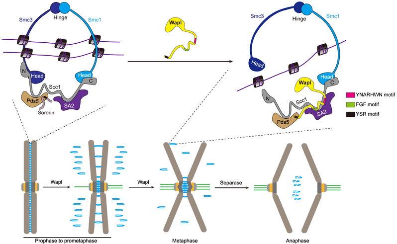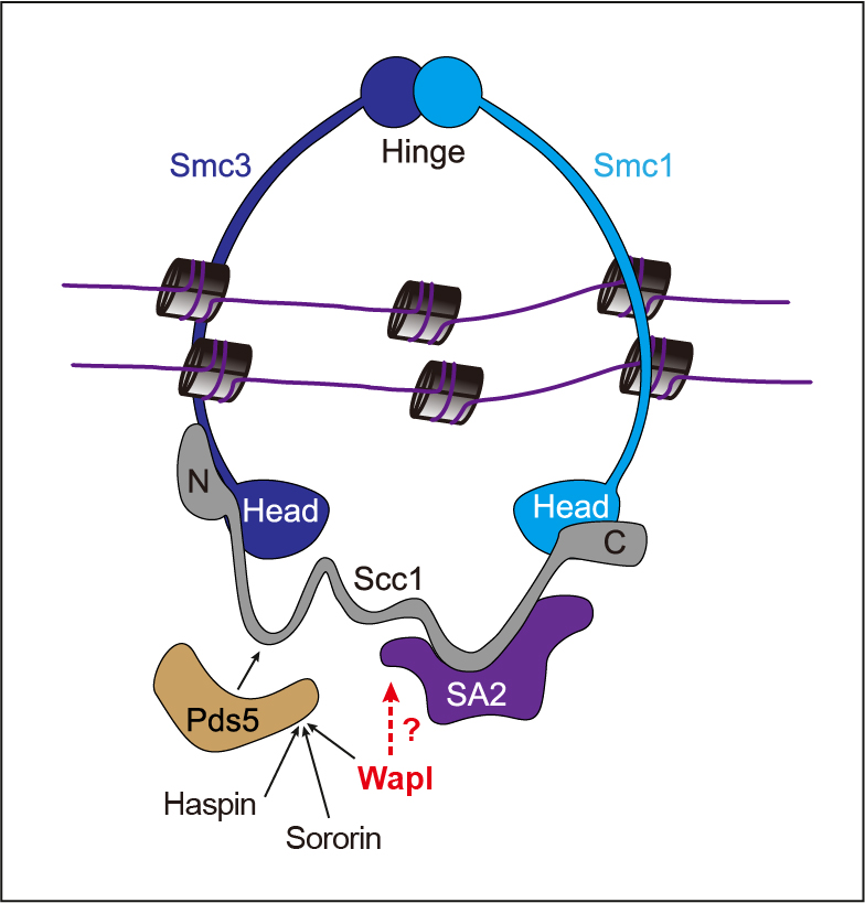图2:介导姐妹染色单体粘连的黏连蛋白复合体及部分调节因子。Wapl可与Sororin、Haspin