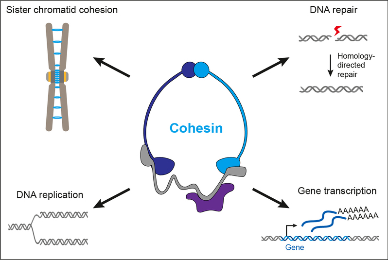 黏连蛋白(Cohesin)是一个在进化上高度保守的环状结构复合体,参与调控一系列基于DNA和染色质的重要生物学过程(图1)。黏连蛋白可以拓扑联结两个DNA分子,通过介导姐妹染色单体粘连(sister chromatid cohesion)调控染色体分离、DNA复制和同源重组DNA修复,进而维护基因组的稳定性。黏连蛋白还可以拓扑结合单个DNA分子,通过形成染色质环(chromatin loop)调控基因组三维构象和基因转录。黏连蛋白的突变常见于癌细胞中,与癌症等疾病的发生发展密切相关。