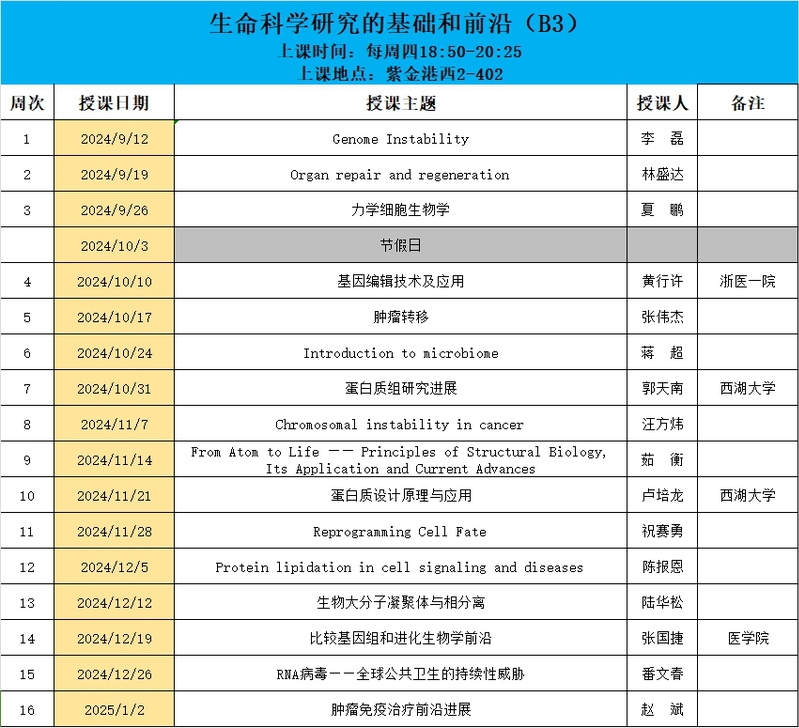 2024-2025年“生命科学研究的基础和前沿”课程安排