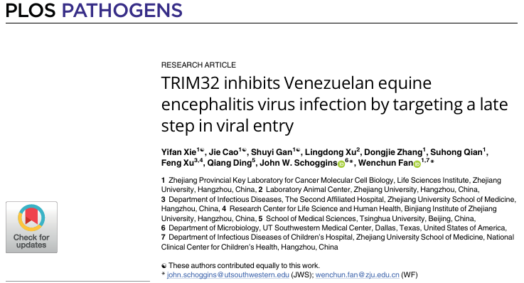 2024年11月11日,我院番文春课题组在微生物学旗舰刊物《PLOS Pathogens》发表题为“TRIM32 inhibits Venezuelan equine encephalitis virus infection by targeting a late step in viral entry”的研究论文,鉴定了宿主E3泛素连接酶TRIM32作为一个新颖的甲病毒限制因子。