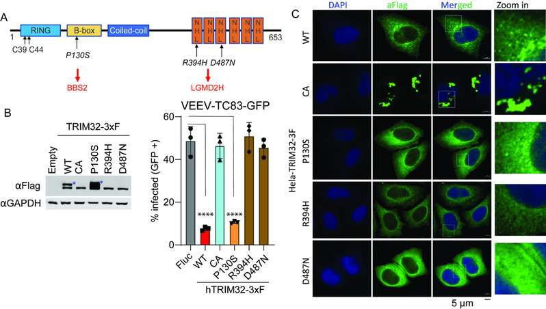 在本研究中,利用课题组建立的“双色荧光流式细胞筛选”策略,分析了118个人RING型E3泛素连接酶对一种由蚊子传播的致脑炎甲病毒——委内瑞拉马脑炎病毒(Venezuelan equine encephalitis virus vaccine strain TC83, VEEV-TC83,人畜共患,尚无FDA批准的疫苗或特异性抗病毒药物)复制的影响,鉴定到TRIM32作为一个新颖的甲病毒(Alphavirus)宿主限制因子。研究中发现TRIM32可抑制多种蚊媒传播甲病毒的复制,包括辛德毕斯病毒(SINV,引起脑炎)和阿良良病毒(ONNV,引起关节炎),而对寨卡病毒(ZIKV,蚊子传播)和柯萨奇病毒B3(CVB3,肠道病毒,粪口传播)无抑制作用。分子机制探索中发现TRIM32对VEEV-TC83的抑制作用不依赖TRIM32-STING-IFN抗病毒信号通路,而是特异性靶向病毒进入细胞后脱衣壳(uncoating)到病毒蛋白翻译的过程,但具体分子细节仍待解析。值得注意的是,研究中还发现TRIM32的病理突变体R394H和D487N(与肢带型肌营养不良症2H型相关)丧失了对甲病毒的抑制功能,且该表型与TRIM32的单泛素化修饰存在重要关联(见下图所示)。未来相关动物模型的建立将有助于探究TRIM32病理突变与甲病毒感染致病的体内相关性。总之,该研究丰富了我们对宿主泛素蛋白酶体系统与病毒相互作用的认识。