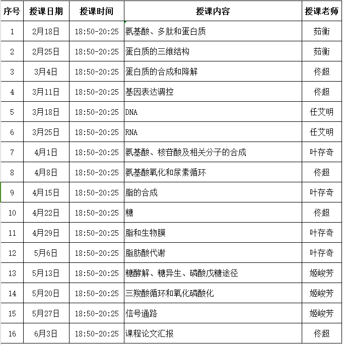 2025年“生物化学进阶”课程安排