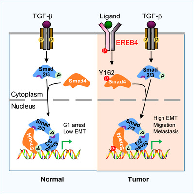 本研究发现,在人非小细胞肺癌中,持续激活的受体酪氨酸激酶ERBB4能够特异性地增强TGF-β的促细胞转移作用,但不影响其生长抑制功能。进一步的机制研究表明,ERBB4通过磷酸化SMAD4的第162位酪氨酸(Tyr162),上调TGF-β下游EMT相关基因的转录,但不影响与细胞生长抑制相关的基因表达。相应地,SMAD4 Tyr162的磷酸化显著增强了TGF-β诱导的肿瘤细胞迁移和肿瘤转移。