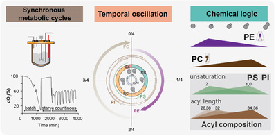 研究团队创新性地选用酿酒酵母(Saccharomyces cerevisiae)作为模式生物,通过精密控制的恒化培养系统(Chemostat culture system)实现了技术突破。该体系通过稳定营养供给、严格维持培养温度、pH值等环境因素,成功建立了细胞代谢与细胞周期高度同步化的细胞群体[2]。酵母细胞与哺乳动物在磷脂代谢通路上具有高度同源性,而酵母磷脂组分相对简单,仅包含百余种,主要源于相对单一的脂肪酸链组成及其化学键类型。同时,酵母模型的同步化培养不仅消除了环境和异质性干扰,还实现了近似单细胞水平的研究体系。在此基础上,基于研究团队开发的高灵敏度的精准定量脂质分析技术[3],团队首次实现了对真核细胞内源性磷脂随细胞周期的动态变化的精准解析。