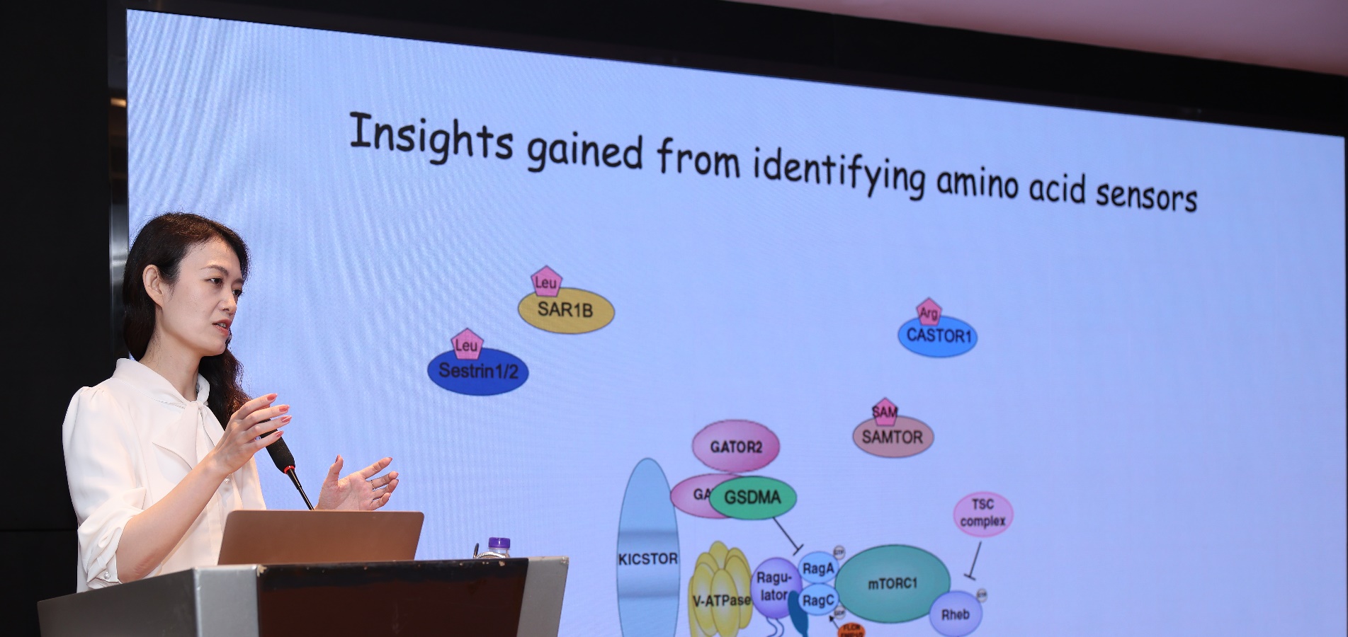 北京大学刘颖教授以“Decoding Amino Acid Sensing: Molecular Machinery and Mechanisms”为题,介绍了SAR1B作为一种新的亮氨酸受体蛋白可以通过与GATOR2的相互作用调节mTORC1的活性。而与已发现的亮氨酸受体蛋白Sestrin2相比,SAR1B对亮氨酸更加敏感,识别亮氨酸和GATOR2不同的结构特征,且组织分布具有差异。该研究发现了一种全新的亮氨酸感受机制。