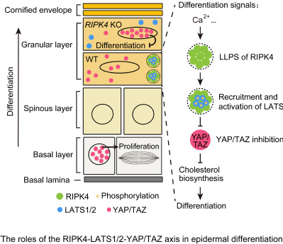 该工作通过筛选人类激酶文库发现RIPK4是Hippo通路中LATS1/2的上游激酶。RIPK4的失活突变会导致人类发育综合征,其特征是表皮分化缺陷。在小鼠中敲除Ripk4模拟了这一表型。该研究发现,Ripk4敲除导致Hippo通路效应分子Yap/Taz在颗粒层中异常激活,进而抑制胆固醇生物合成,而进一步敲除Yap/Taz部分挽救了皮肤屏障缺陷。机制上,RIPK4招募LATS1/2进入液液相变颗粒,直接对其进行磷酸化。疾病衍生的RIPK4突变体由于激酶活性受损或相分离缺失,从而导致LATS1/2激活缺陷。