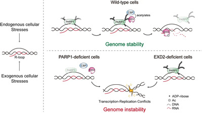 当PARP1缺失或其酶活性受到抑制时,EXD2和CBP无法有效招募至R-loop位点;而在EXD2缺陷的情形下,PARP1虽可识别R-loop,但失去了其下游执行清除功能的效应因子。上述任一情况均会导致R-loop积累、TRCs加剧,最终诱发基因组不稳定性。