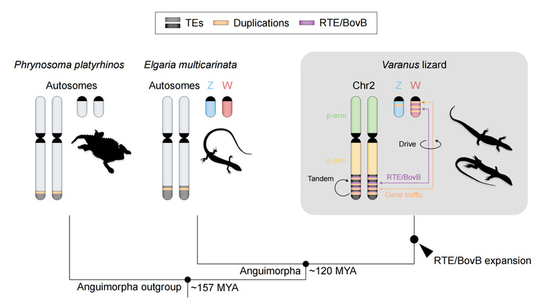 研究团队此前发现,在一种巨蜥中,雌性特有的W染色体与2号常染色体的长臂(q arm)存在大量同源序列,而雌雄共有的Z染色体无此现象,暗示其性染色体存在复杂的演化事件。为解开这一谜团,团队构建了该物种染色体级别的基因组,分析发现W染色体与2号常染色体末端(2q-end)富集大量相同的转座子(RTE-BovB)。这些转座子在巨蜥祖先中爆发扩增,介导了W染色体与2号常染色体之间大规模的序列交换。虽然这一过程是双向的,但更多的是将常染色体上的基因“搬运”到了W染色体上,其中以与嗅觉和信息素识别相关的犁鼻器受体(V2R)基因家族占比最高。虽然这些基因身处W染色体——一个通常被认为正在“退化”的环境,但不少成员依然保持功能完整性,可能赋予了雌性巨蜥某些独特的生理功能。