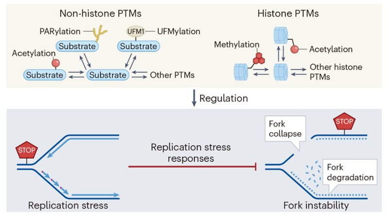DNA复制是遗传信息准确传递的核心环节,但常受到内源性或外源性因素的干扰,导致复制叉停滞甚至崩塌,引发基因组不稳定,这一现象被统称为复制压力。该综述系统梳理了复制压力应答的分子机制,包括复制检查点激活(replication checkpoint activation)、复制叉反转(fork reversal)、跨损伤DNA合成(translesion DNA synthesis, TLS)及复制重引发(repriming)等关键过程,并总结了近年来的主要研究进展。文章重点阐述了蛋白质翻译后修饰如何通过动态调控蛋白质的稳定性、定位与活性,协调复制叉的稳定与重启,确保基因组复制的准确与完整。