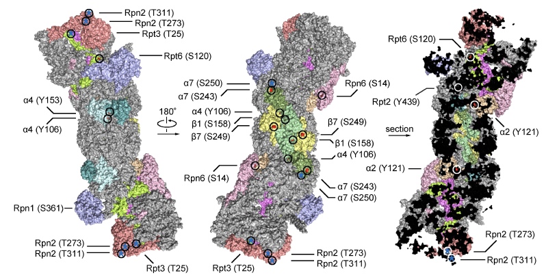 磷酸化是最常见的蛋白酶体修饰之一,也是蛋白酶体接入细胞信号转导网络的重要方式。我们在蛋白酶体磷酸化方面积累了丰富的研究经验。下图列举了一小部分具有已知或潜在生物学功能的蛋白酶体磷酸化位点。值得注意的是,人类26S蛋白酶体表面已知存在450个以上的磷酸化位点,而其中超过95%的位点还没有任何研究。