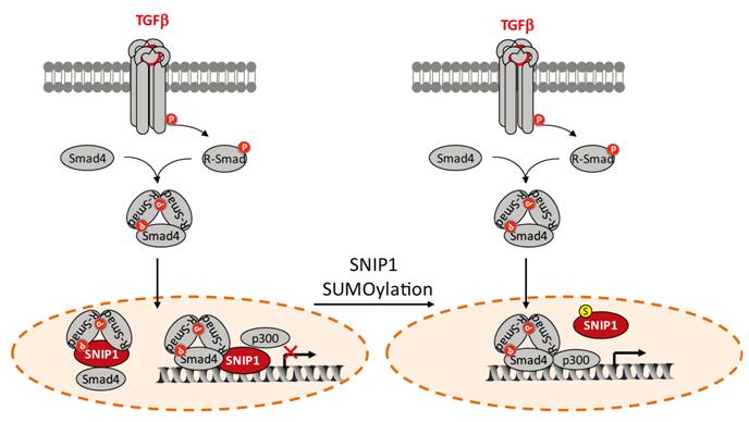 Secondly, functional assays showed that SNIP1 inhibits TGF-beta-induced transcription, cell migration and invasion, and significantly SUMO modification reverses the inhibitory effects of SNIP1 on the TGF-beta responses. Mechanically, SUMO modification impairs the activity of SNIP1 in disrupting formation of the Smad complex and attenuating the recruitment of p300 to Smad proteins. Consequently, SUMO modification disables SNIP1 in suppressing TGF-beta signaling.