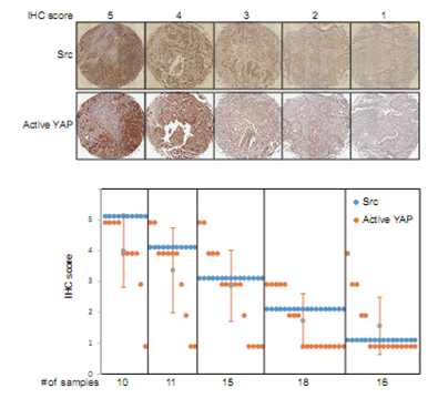 In this study, Dr. Bin Zhao’s group reported tyrosine phosphorylation of the Hippo pathway tumor suppressor LATS1 as a mechanism underlying its regulation by cell adhesion. A tyrosine kinase library screen identified Src as the kinase to directly phosphorylate LATS1 on multiple residues. Cell matrix adhesion activated the Hippo pathway effector transcription co-activator YAP partially through Src-mediated phosphorylation and inhibition of LATS1. Aberrant Src activation abolished the tumor suppressor activity of LATS1 and induced tumorigenesis in a YAP-dependent manner. Protein levels of Src in human breast cancer tissues correlated with accumulation of active YAP dephosphorylated on the LATS1 target site.