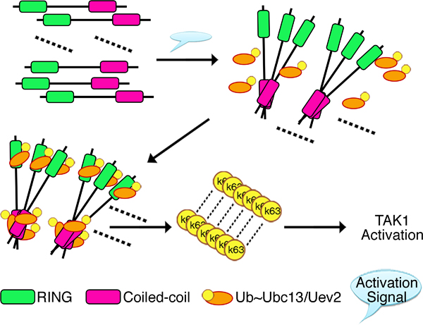 In this study, Dr.Xia’s group found that only long polyubiquitin chains are potent in TAK1 activation. This preference of long polyubiquitin chains determines TRAF6 to be a processive enzyme. In addition, they revealed that TRAF6 coiled-coil (CC) domain is crucial to enable its E3 ligase processivity. The CC domain mediates TRAF6 higher order oligomerization, which effectively enables its RING domains to bind simultaneously to multiple Ubc13/Ub~Ubc13, therefore contributing to its processivity. Mutating or deleting the CC domain impairs TRAF6 oligomerization and processive polyubiquitin chain assembly. Fusion of the CC domain to the E3 CHIP, which is a U-box E3 ligase, renders the latter being capable of NF-κB activation. More importantly, the CC domain, after oligomerization, interacts with Ubc13/Ub~Ubc13, which renders spent Ubc13 to be recharged with Ub without its dissociation from TRAF6 to optimize TRAF6 processivity. Point mutations within the CC domain that weaken TRAF6 affinity to Ubc13/Ub~Ubc13 diminish TRAF6 processivity, which results in inactive TRAF6 in IL-1β-induced TAK1 activation. In conclusion, the results reveal that the CC oligomerization primes its interaction with Ubc13/Ub~Ubc13 to optimize the processivity of TRAF6 ubiquitin ligase activity in the IL1R/TLR signaling pathways.