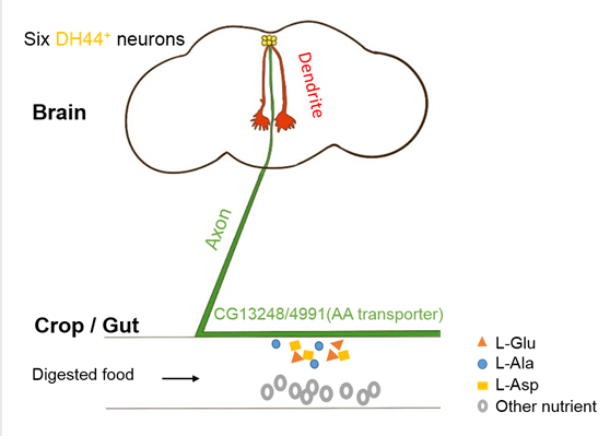 In aggregate, we have identified DH44+ neurons as a novel sensor in the fly brain that rapidly detects specific dietary amino acids and promotes amino acid consumption. These dietary amino acids may enter DH44+ neurons via CG13248 to excite these neurons, which may release DH44 neuropeptide and promote feeding through two DH44 receptors in downstream neurons.