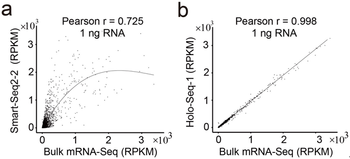 a. An RPKM scatterplot of expressed genes between Smart-Seq2 and bulk mRNA-Seq. b. An RPKM scatterplot of expressed genes between Holo-Seq (mRNA) and bulk mRNA-Seq.