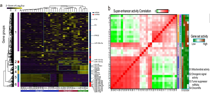 b. Correlation heat map of the genome-wide super-enhancer activity of32 HCC single cells (Left panel).The cells are rankedin the same order as figure a.Right panels is the relative expression heat map of the gene sets related to mitochondrial activity, oncogenic signals pathways, tumor suppressor miRNAs and oncomiRs of32 HCC single cells.