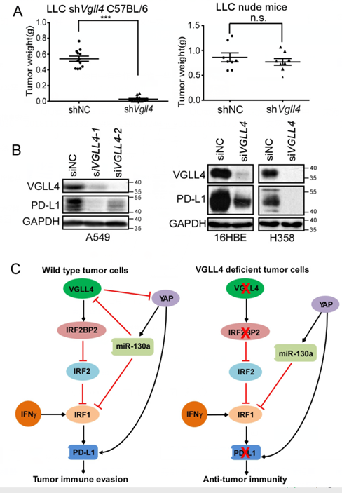 Figure legend. A. Downregulation of Vgll4 in LLC cells strongly inhibits tumor growth in C57BL/6 mice, but not in nude mice. B. Downregulation of VGLL4 suppresses PD-L1 expression in human lung cancer cells. C. Model for the regulation of PD-L1 expression by VGLL4 and YAP. VGLL4 regulates PD-L1 expression through controlling IRF2BP2 protein stability. YAP represses IFNγ-inducible PD-L1 expression partially through miR-130a-mediated inhibition of VGLL4 and IRF1 expression.