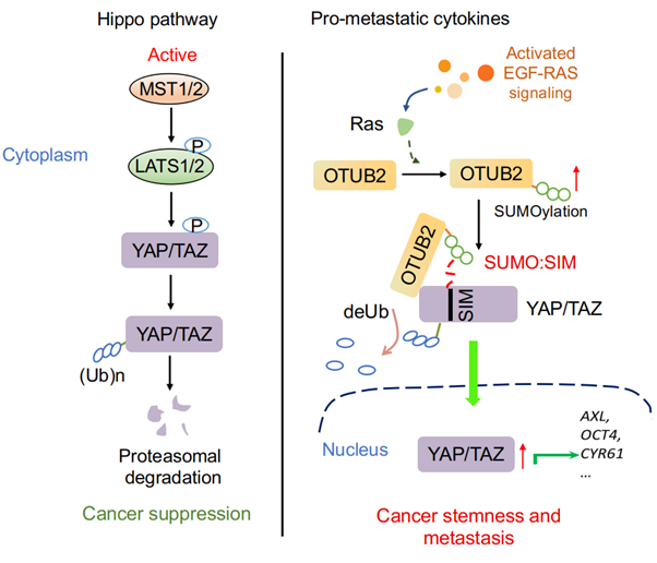 Working model of SUMOylated OTUB2-mediated YAP/TAZ deubiquitination: this is the first report of DUB-mediated control of YAP/TAZ proteins, and also the first report that YAP/TAZ are regulated by KRAS via a mechanism that was so far completely unknown. They answered how YAP and TAZ proteins are maintained and activated in human malignancies.