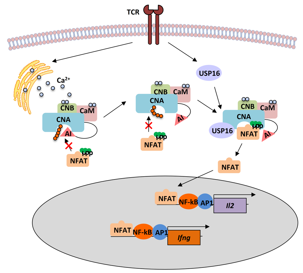 Taken together, this study identifies USP16 controls maintenance, proliferation and activation of peripheral T cells through regulating calcineurin-dependent NFAT activity, and a novel immunosuppressive drug target for the treatment of autoimmune diseases.