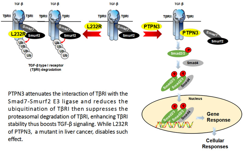 TGF-β controls a variety of cellular functions. Dysregulation of TGF-β is commonly found in human diseases such as cancer. Since the tight control of TGF- signaling is particular important in maintaining the normal function of cell and tissue homeostasis, it is significant to identify additional key players in regulating TGF- signaling pathway. The authors found that protein tyrosine phosphatase non-receptor 3 (PTPN3) profoundly potentiates TGF- signaling independent of its phosphatase activity. PTPN3 stabilizes TGF- type I receptor (TRI) through attenuating the interaction between TβRI with the Smad7-Smurf2 E3 ligase. Consequently, PTPN3 facilitates TGF--induced R-Smad phosphorylation, transcriptional responses, and subsequent physiological responses. Importantly, the leucine-to-arginine substitution at amino acid residue 232 (L232R) of PTPN3, a frequent mutation found in intrahepatic cholangiocarcinoma (ICC), disables its role in enhancing TGF- signaling and abolishes its tumor suppressive function. These findings add PTPN3 as a novel regulator of TGF- signaling and elucidate an essential function of PTPN3 in regulating tumor progression. Understanding how cancer-derived mutants of PTPN3 function in tumorigenesis has important clinical implications in cancers and other diseases.