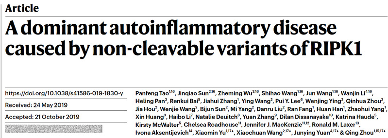 On December 12, 2019, Qing Zhou's group from the Life Sciences Institute of Zhejiang University, Junying Yuan 's group from Harvard Medical School, and Xiaochuan Wang 's group from Children’s Hospital of Fudan University jointly published a research article in Nature entitled A dominant autoinflammatory disease caused by non-cleavable variants of RIPK1, which reported that the RIPK1 cleavage site variants caused severe auto-inflammatory diseases. The revealed molecular mechanism of the disease guided clinical treatment and greatly relieved the clinical symptoms of patients.