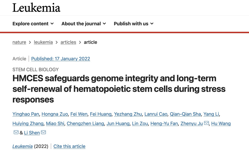Li Shen’s laboratory recently published a research article entitled “HMCES safeguards genome integrity and long-term self-renewal of hematopoietic stem cells during stress responses” in Leukemia on January 18, 2022, reporting the role of HMCES in saf