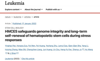 Li Shen’s laboratory recently published a research article entitled “HMCES safeguards genome integrity and long-term self-renewal of hematopoietic stem cells during stress responses” in Leukemia on January 18, 2022, reporting the role of HMCES in saf