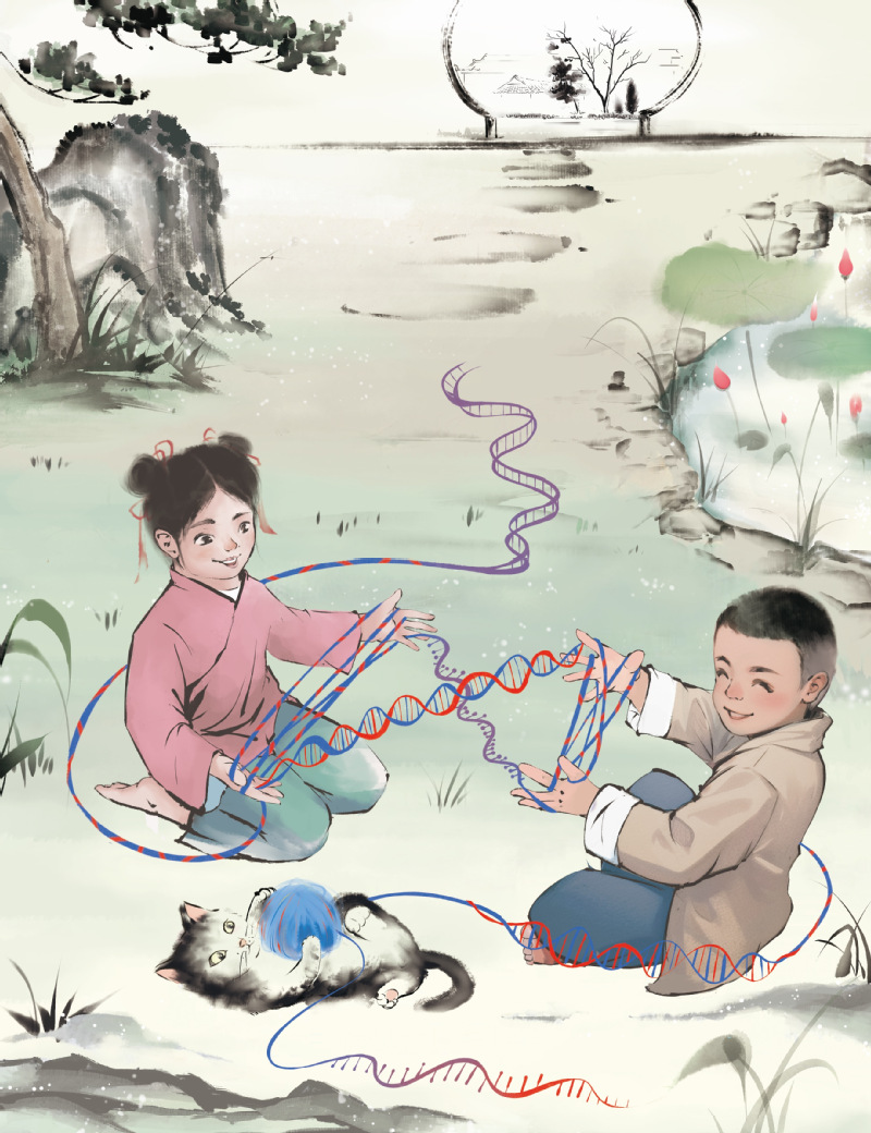 Fig 1. Tn5 tagments different kinds of nucleic acids. Two kits are playing cat's cradle on the playground just like two Tn5 transposases act at different types of nucleic acids. Two kids represent two Tn5 transposases; the strings used by the two kids represent double-strand DNA, single-strand DNA, and DNA/RNA hybrid. The substrates used by Tn5 transposase are very diverse.