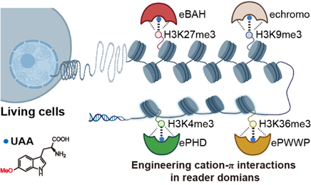 Figure 1. Engineering cation-π interactions of histone H3 trimethylation readers with high affinity and specificity in living cells via genetic code expansion.