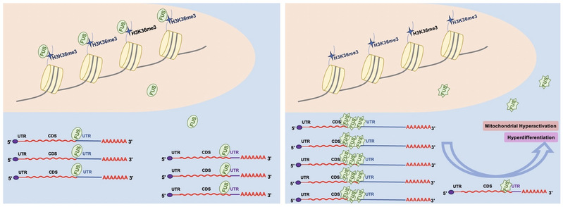 FUS has been involved in multiple levels of RNA processing including transcription, splicing, transport and so on5. Mutations in the Fus gene cause amyotrophic lateral sclerosis (ALS)6, a neuron degenerative disease. Here, this study identified FUS as a reader for H3K36me3. Depletion of H3K36me3 at gene bodies released FUS from chromatin and increased the interaction of FUS with mRNA, which, in turn, led to APA selection being distant from the stop codon. The binding between FUS and H3K36me3 depends on proline residues in the ZNF domain of FUS, and therefore, mutations of proline residues cause loss of chromatin association and increased mRNA binding, resulting in an increase in distal APA selection. Moreover, loss of H3K36me3 recognition by FUS, which is mimicked by a proline mutation in FUS in ALS, contributes to hyperactivation of mitochondria and hyperdifferentiation in mouse embryonic stem cells (mESCs) (Figure 1).